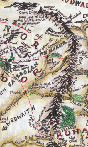 - Ostseite: Langquell (einer der Quellflüsse des Anduins), Rhimdath (Niederfall), Ninglor (Schwertel), Nimrodel, Limklar, Onodló (Entwasser).