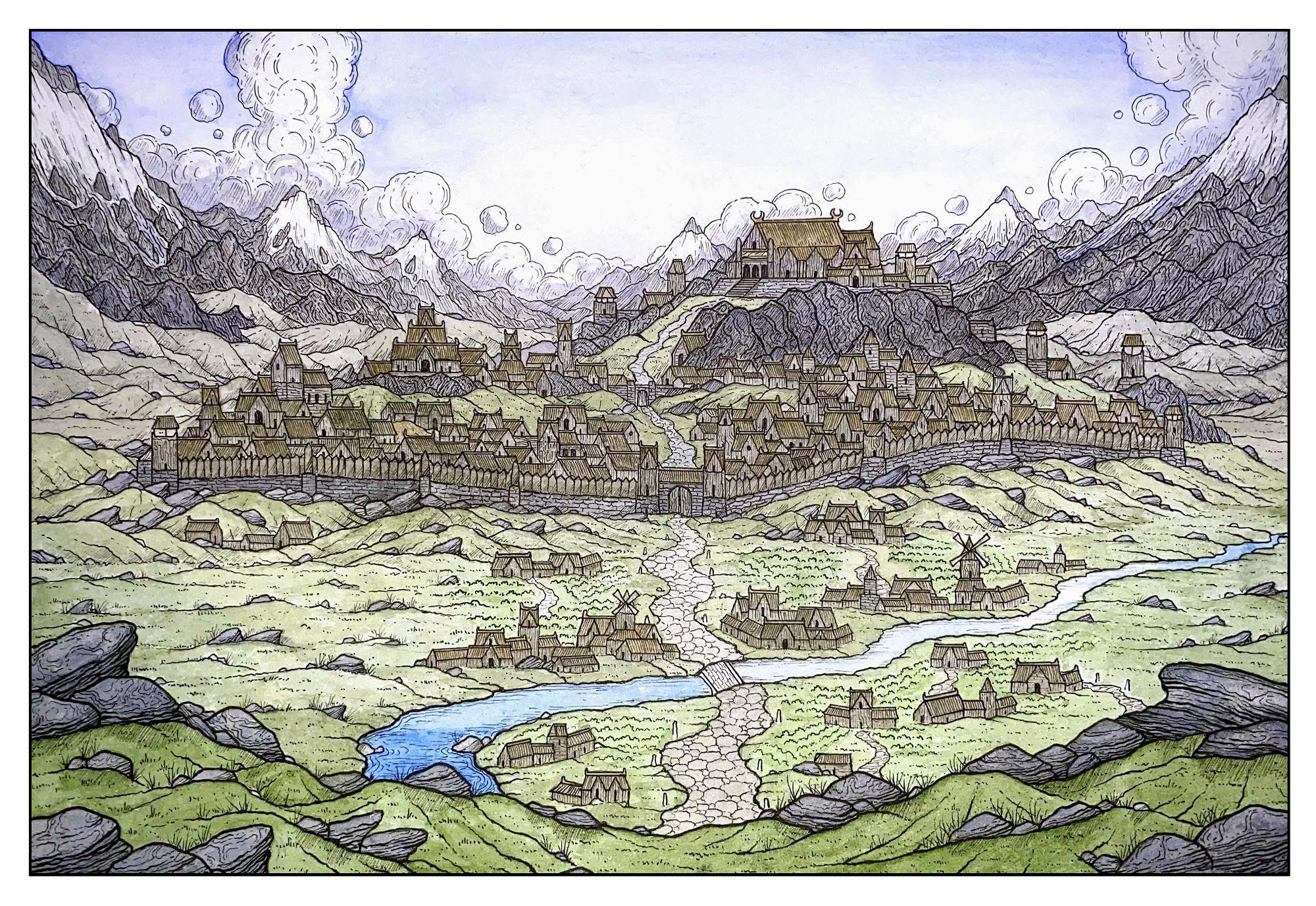 Zeichnung von Edoras nach Vorlage der Peter Jackson Filme.