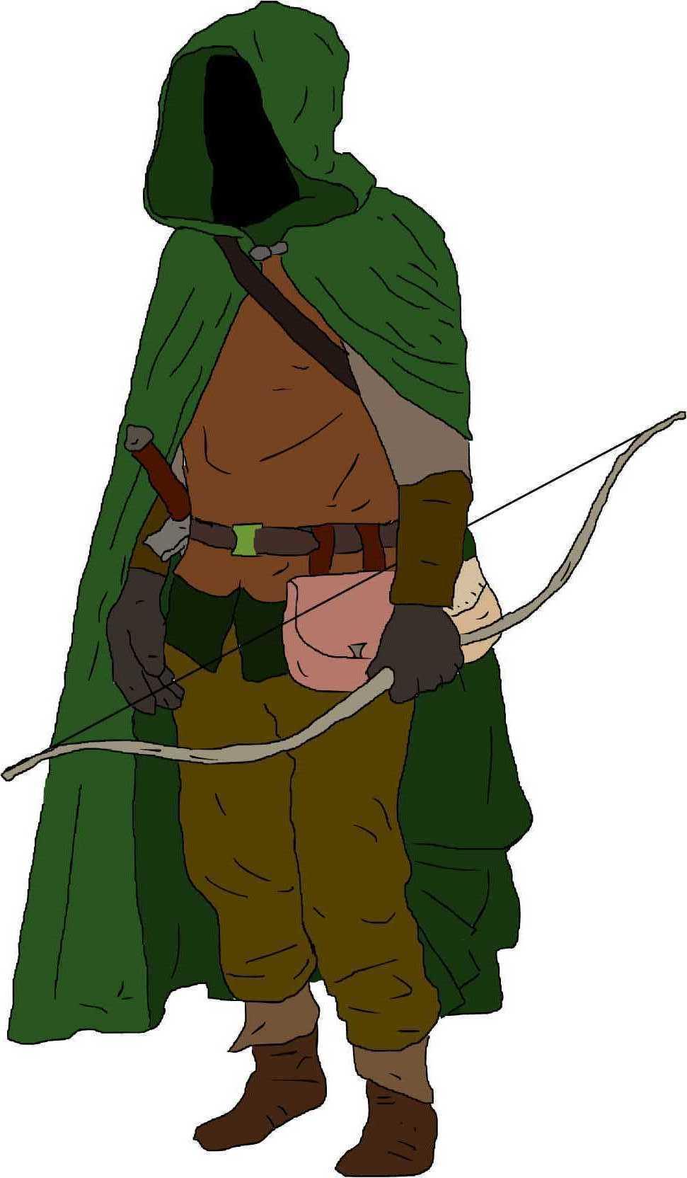 ein Waldläufer ohne Gesicht mit Bogen und Schwert; farbig