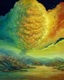 - Nach der sogenannten Version der Runden Welt wurden die Bäume nach der Sonne geschaffen, nachdem Arien von Melkor geschändet worden war, woraufhin sie Arda verließ. Die Sonne verlor daraufhin das ursprüngliche reine Licht, das ihr von Varda gegeben worden ist, aber in den Zwei Bäumen weiterleben. Aman war zu dieser Zeit von Nurmenel überkuppelt.[1]